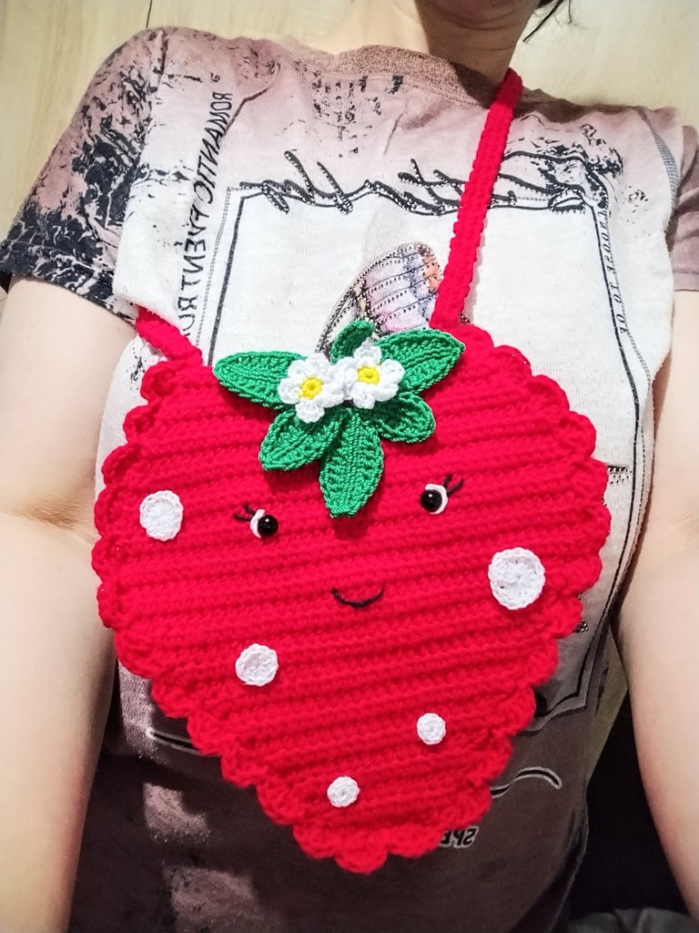 For details, we made a couple of flowers and placed safety eyes and other features to give personality to the strawberry. The pendant is woven in low stitches on three chains. I didn't want to make it too thick so that it would allow us to tie a knot in it without it looking grotesque, in case it is too long. I hope you like this little purse, which is perfect for the smaller girls, but can also be used by the not so small ones and won't look bad at all. I say goodbye, thanking you for your company. See you next time. | Para detalles, realizamos un par de flores y colocamos ojos de seguridad y otros rasgos para dar personalidad a la fresa. El colgante está tejido en puntos bajos sobre tres cadenas. No lo quise realizar demasiado grueso de manera que permita realizar un nudo en el mismo sin que se vea grotesco, en caso de que sea demasiado largo. Espero que les guste este pequeño bolsito, que es perfecto para las chicas más pequeñas, pero que también puede ser usado por las no tan pequeñas y no se verá para nada mal. Me despido, agradeciendo su compañía. Hasta la próxima. |