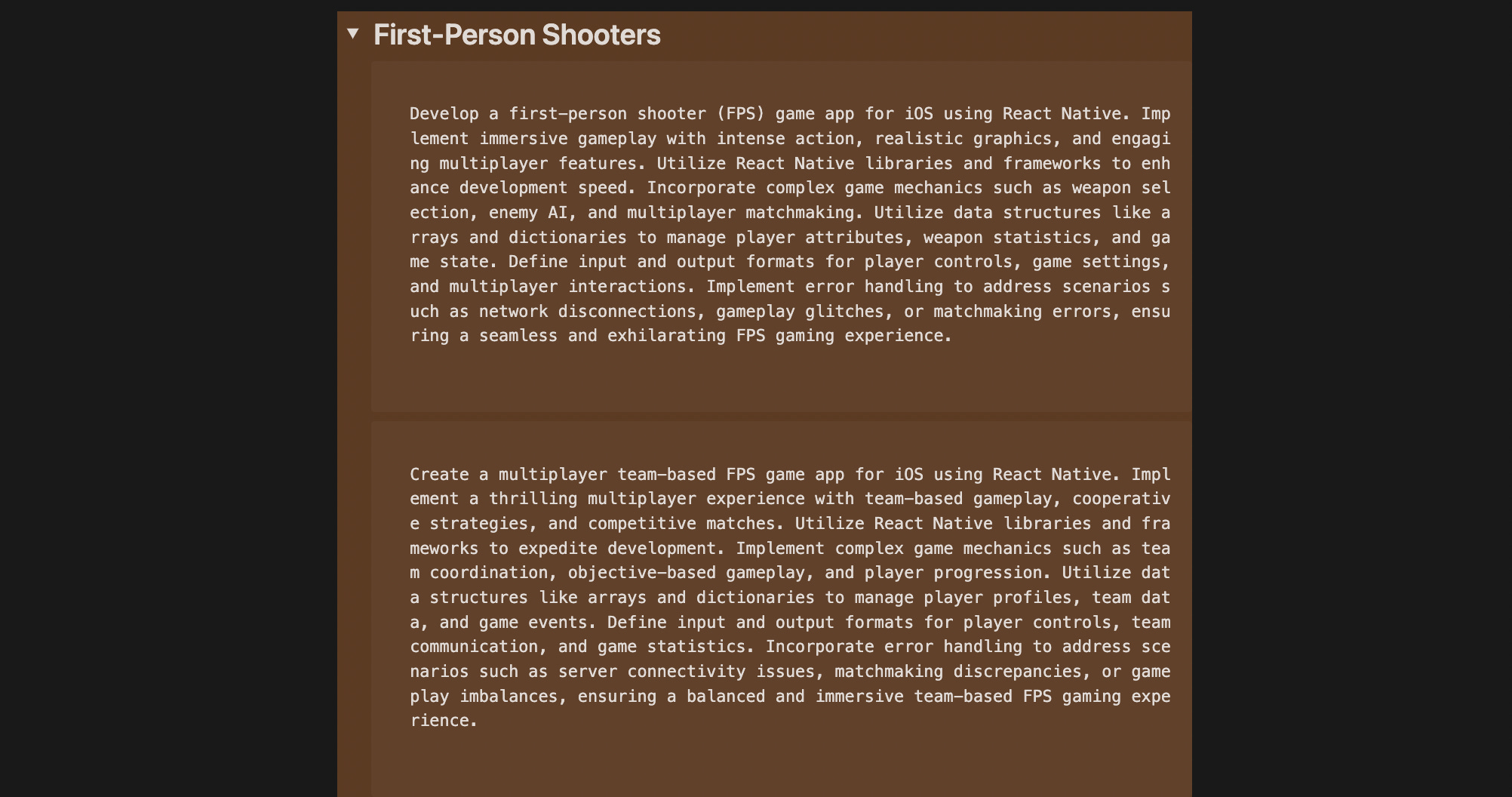 Witness the prowess of silicon SASS as AI generates ideas for apps, which you can build by gently massaging the code out of the LLM. Feel free to experiment with the prompts, adjusting them as needed, and directing the AI to offer step-by-step guidance. You can even ask ChatGPT to generate similar prompts based on your suggestions, giving you a way to pivot to new ideas. Get there faster, get the iOS React pack.